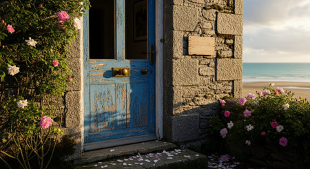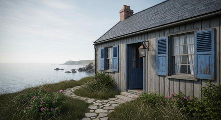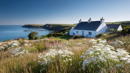 Idyllic coastal cottage nestled within a vibrant meadow of wildflowers and green grass, offering a serene view of the ocean