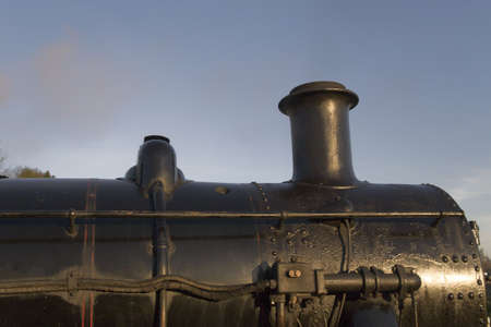 Close up of the boiler and chimney on an old steam locomotive.
