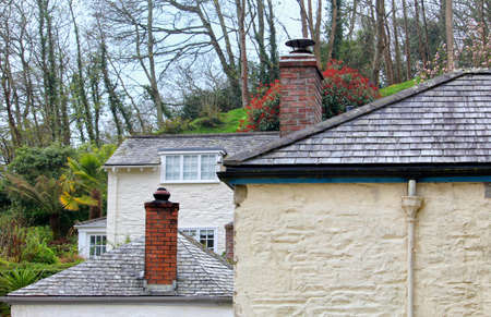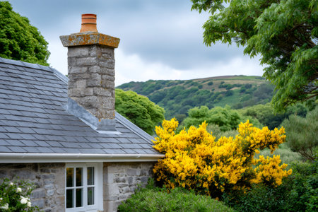 Idyllic English country cottage with slate roof, stone chimney and yellow flowers, showing traditional British architecture