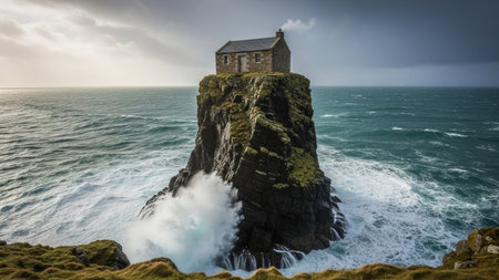 Remote white cottage nestled on a green hillside by a stone wall, watching the peaceful blue sea and distant cliffs