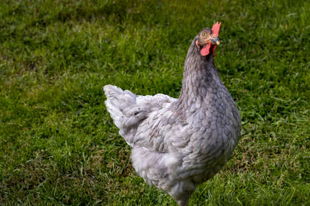 chicken in grass on a farm. Hen on a traditional free range poultry organic farm grazing on the grass with copy space or for banner.