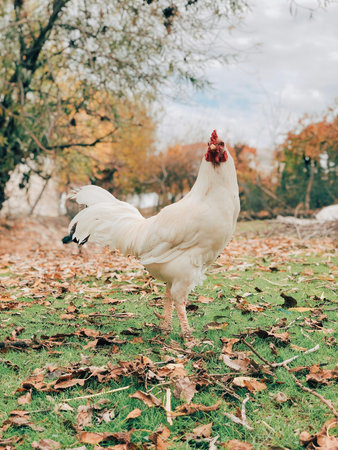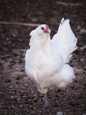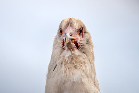 White chicken portrait closeup outdoors. Young hen in the village. Concept of farming and rural life