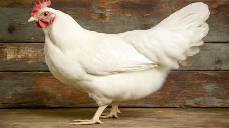 A white chicken stands proudly on a wooden surface, showcasing its pristine feathers and charming appearance, perfect for agricultural and farm-themed projects.
