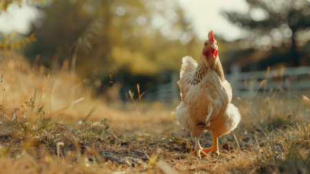 Spread wings of rooster in rural scene generated by artificial intelligence