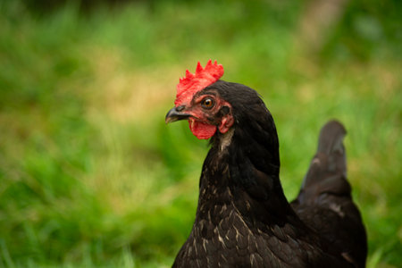 Portrait of a black adult chicken on a farm, portrait, close-up. Breeding of laying hens, modern agriculture. Farming and raising animals in a natural environment. Chicken grazing, farm animals.