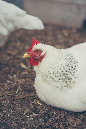 Close up of chickens in the coop. Hen in a farmyard - selective focus