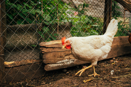 White Chicken Wandering Near a Wooden Fence in a Rustic Farmyard During the Daytime.