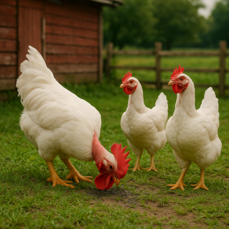 AI-generated image of a naked-neck Rooster with two hens on a farmm backyard.