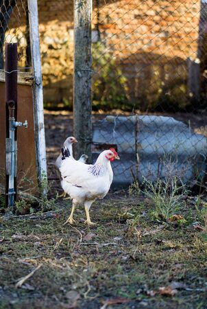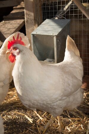 White Chicken. Domestic bird. Hens on the farm. Bird in the paddock. Household. Chicken Lays Eggs