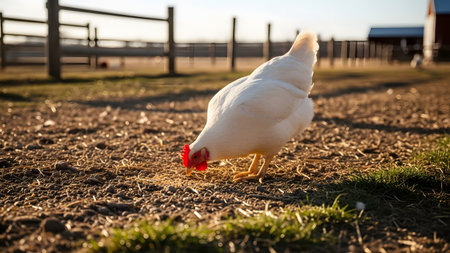 A close-up of a white chicken pecking at the ground in a farmyard. The bird is illuminated by warm sunlight, with a blurred background of fences and a barn.