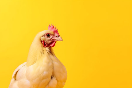 Chicken on yellow background with copyspace. agriculture and farming concept. Generative AI.