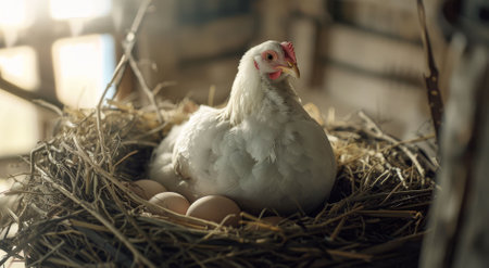 Hen in straw nest. White bird hatching egg. Cock, rooster and chicken. Fresh organic farming food. Livestock animal. Farm henhouse