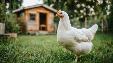 AI generated realistic hen standing in a rustic chicken coop with soft light filtering through the window highlighting its feathers. Natural shadows and textures enhance the cozy atmosphere.