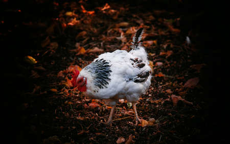 White hen looking for food in the farm yard. Chickens. Free Range Cock and Hens