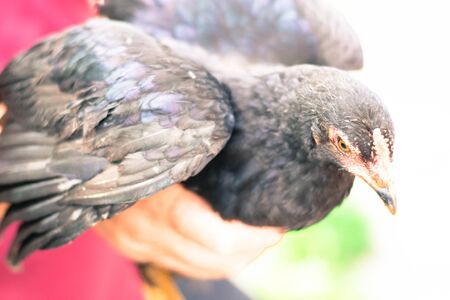 Close up of black chicken on a farm in nature. Hen in a free throw farm. Hen walk in the yard of the farm. The concept of rural life. Agriculture. Country life