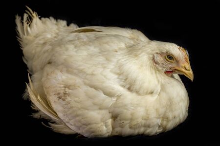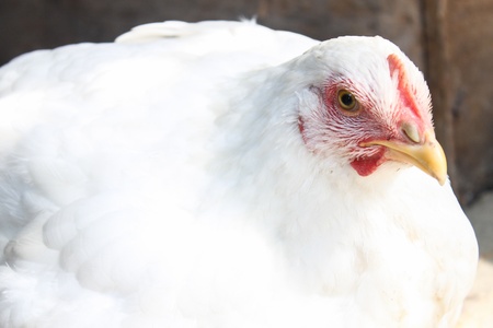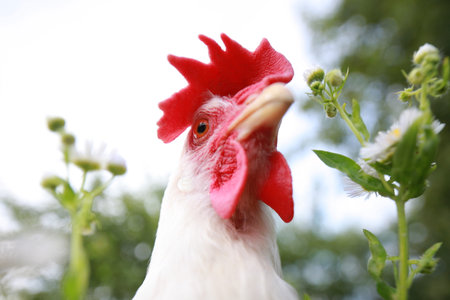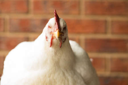 White chicken portrait closeup outdoors. Young hen in the village. Concept of farming and rural life