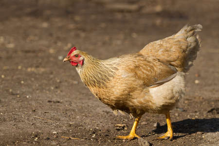 Rooted In Nature. Close up of a hen in a farmyard (Gallus gallus domesticus). Organic farming, animal rights, back to nature concept. Horizontal shot
