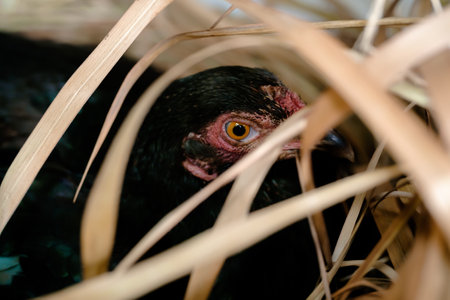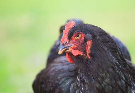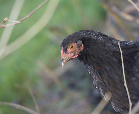 Portrait of a beautiful charismatic chicken of black color in profile in a natural environment with a beautiful soft bokeh, close-up shot of a macro