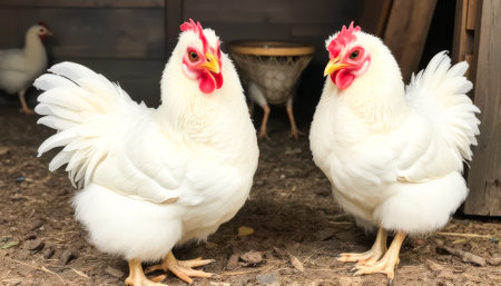 A white chicken with a striking red comb stands out in a lively farm environment, surrounded by other chickens, highlighting rural agriculture and animal husbandry