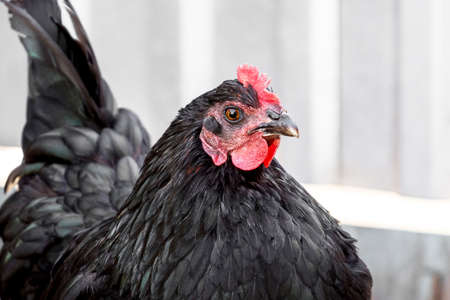 Chicken close-up. Black chicken on the farm. Livestock farm. Poultry farm. Laying hen.