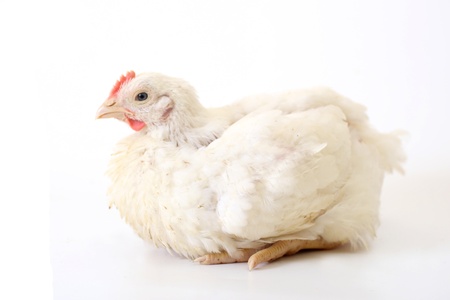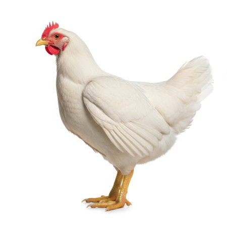The image features a single white chicken standing upright against a plain white background. The chicken has a bright red comb and wattles, with yellow legs and feet. Its feathers are smooth and uniformly white, and it appears to be in a calm and relaxed posture.