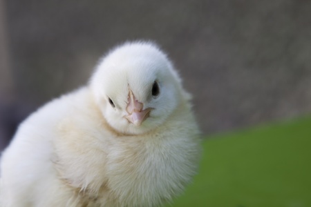 Fat white broiler chicken standing on green grass with an angry bird look on her face