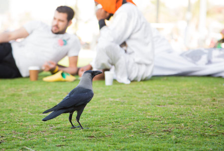 Black crow walks on green lawn. Raven on grass. Wild bird on meadow. Predatory animal of city fauna. Background of wild animal.
