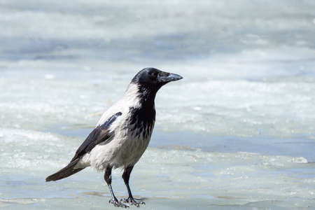crow stands on the ice of a frozen pond in the Park