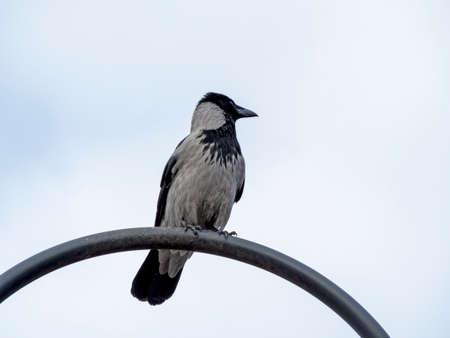 Hooded crow, Corvus cornix, also known as gray crow, sits on a branch against a blue sky background
