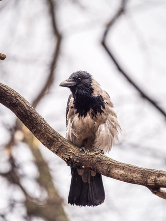 A hooded crow sitting on a tree. The hooded crow, Corvus cornix, also called hoodie