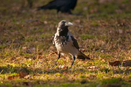 Hooded crow, corvus cornix, also called the hoodie, standing on the lawn in the autumn or spring forest