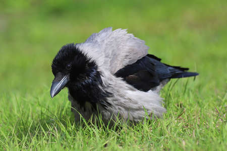 Dishevelled hooded crow - Corvus cornix - in the park on the grass in spring on a green blurry background