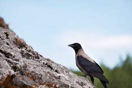 Gray crow on a stone close-up, against the sky