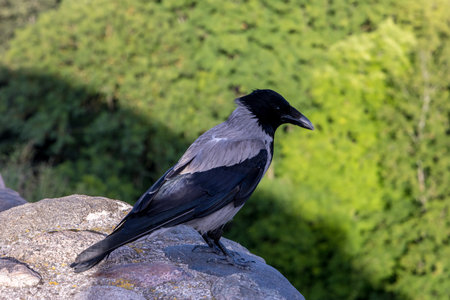 A hooded crow sitting on a wall in Vilnius in Lithuania on a sunny day in summer.
