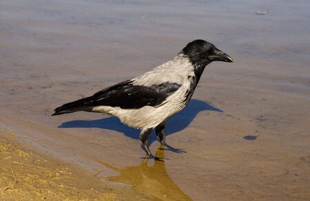 Crow on the beach. Carrion crow walking on sands. Corvus corone. Lausanne, Switzerland.