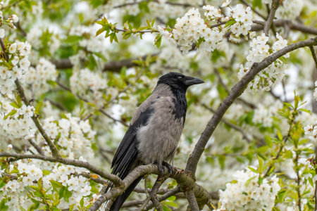 Close view of a hooded crow Corvus cornix resting on a branch in cherry blossoms Prunus avium. Detailed feathers stand out against soft white blooms.