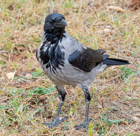 gray crow with a black head and chest looking for food in the meadow on a sunny spring day