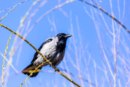 Beautiful close-up shot of the hooded crow (Corvus cornix) sitting in a birch tree branches flowering with yellow flowers. Wildlife scenery
