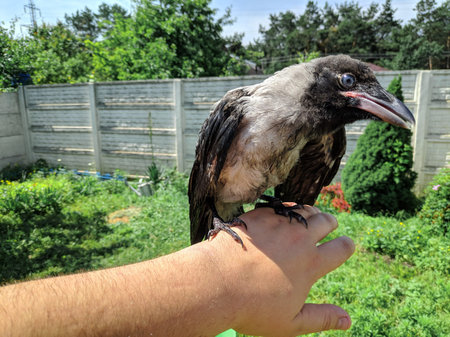 crow on the tree. crow in hand. crow chick. people are holding in their hands a cry forty