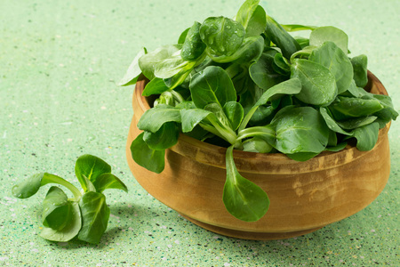 Fresh lamb's lettuce (Valerianella locusta, corn salad) in a wooden bowl on a green background