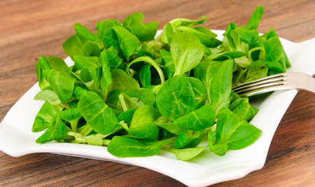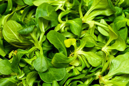 Corn salad, green lettuce leaves background. Valerianella locusta, Rapunzel plant food photo