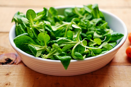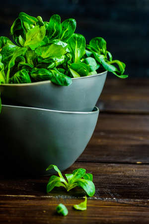 Organic corn salad or lamb's lettuce leaves in a bowl on a rustic wooden table, copy space, selected focus, narrow depth of field
