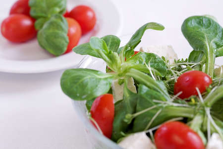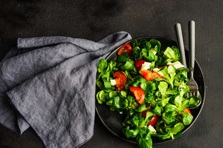 Fresh green Corn salad leaves or lamb's lettuce with tomatoes and olive oil. Top view