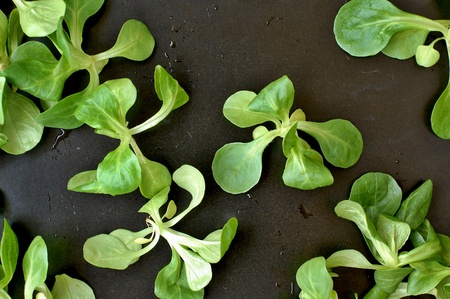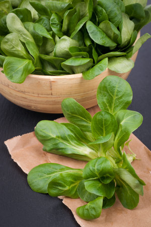 Fresh Lambs lettuce, empty copy space for text, green salad, vegan food, ingredients