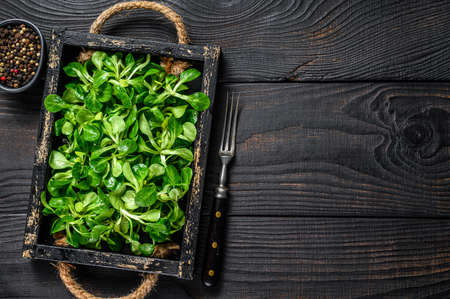 Fresh green lambs lettuce salad leaves on a wooden tray. Black wooden background. Top view. Copy space