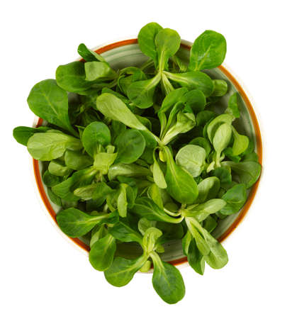 Fresh green Corn salad leaves or lamb's lettuce in bowl. Top view