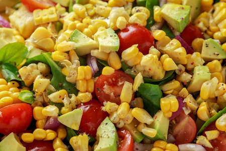 Salad with raw vegetables and corn in a plate on the table. Selective focus.