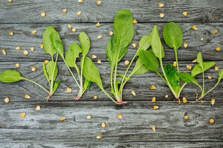 Baby spinach leaves plants on gray rustic wooden background. Dry corn seeds between them. First spring crop. Vegetarian vegan healthy organic local food. Grow your own