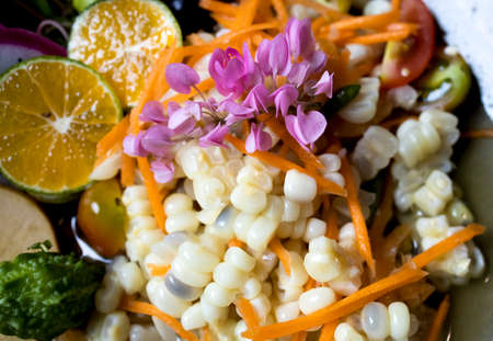 Closeup of asian style sweet corn salad with edible flowers decoration.