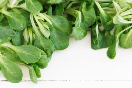 Flat lay photo - corn salad ( Valerianella locusta ) green leaves on white working board, space for text on right side